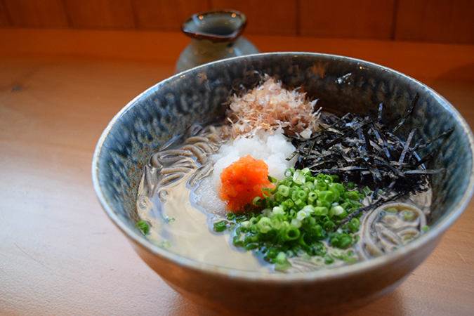 神話の里の香り豊かな出雲そば。 こだわりのそば粉は、出雲産を中心に独自に厳選した国内産の玄そばを石臼で挽き、毎朝職人が手打ちしております。コシのあるそばを、うるめいわしがベースの濃厚なだしでお召し上がりください。また、そば屋ならではの甘味もございます。