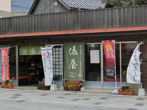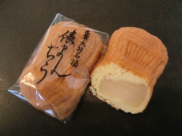 創業は明治31年。看板商品の俵まんぢうは、出雲大社の御祭神である、オオクニヌシノミコトこと、大国様(ダイコクサマ)が、大きな袋を肩に掛け、打出の小槌を片手に持ち、俵の上ににこやかに座っておられるところから、そのご神徳にあやかり、福徳円満、五穀豊穣、良縁に恵まれますようにと、縁起の良い俵の形をモチーフに、お菓子にしました。まわりをふんわりカステラ生地で包み、中には口溶けの良い、手亡豆(テボウマメ)の風味を生かした、自家製の白あんが入っています。一畑電鉄・出雲市大社前駅から出雲市大社方面へ徒歩5分。