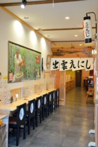 出雲蕎麦専門店 そば農家と契約した玄そばを石臼挽きにして自家製粉しています。 ゆっくりと旨さを引き出したそば粉を上質な水で仕上げ、コシと風味の強いそば作りにこだわっています。 広い店内でそばの味をお楽しみください。また、広いトイレ車イスでの利用も できます。