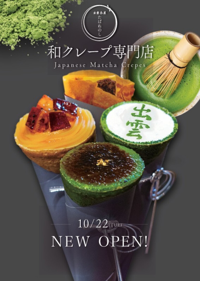 日本一を受賞した掛川抹茶をふんだんに使用した和クレープ。トップをキャラメリゼし金箔をのせた『ブリュレ』、「出雲」の漢字デザインをあしらった『ティラミス』はSNS映え間違いなしです。抹茶生地の他にもプレーン生地の『蜜芋』や季節限定商品、『あんこバター』『シュガーバター』も人気です。